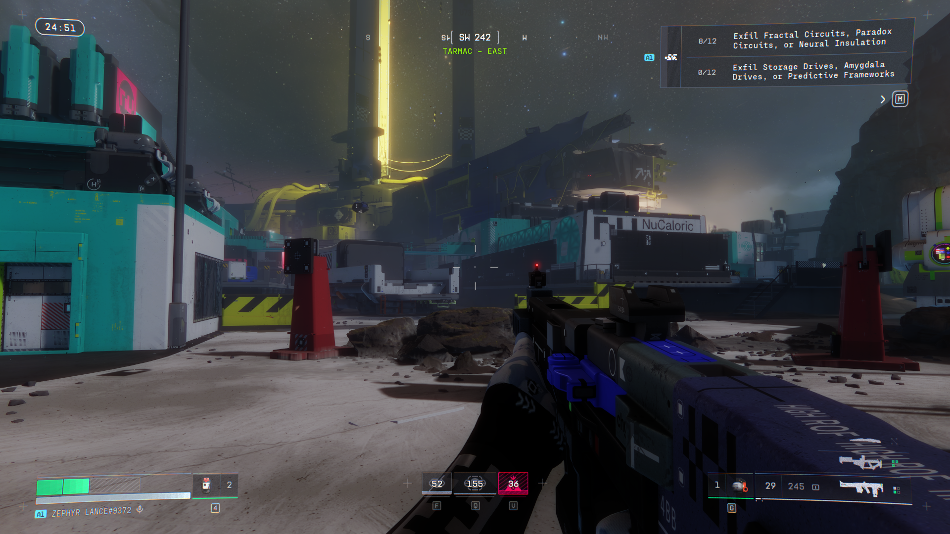 I appreciate that these are the main things you have to worry about. In other first- or third-person multiplayer shooters I’ve played, I’ve always felt rushed by the false, always-shrinking wall they tend to draw around the map. I didn’t like that these games tried to coerce me into action, to shepherd me closer and closer to enemies, to eliminate the chances of emergent play coming from me or anyone else. In Marathon there are no rules about when or how or where you exfil, just as long as you’re able to do so in 26 minutes. You can spend an entire run exploring, or simply sitting in a corner of the map waiting for a sucker to walk by. I tend to keep moving, but I like to do so slowly and quietly. I figure any noise I can hear is a noise someone else definitely heard. I hate punching out vent screens but sometimes those are the only avenues of escape. This is especially true on Outpost, where every building feels like a trap. With everyone trying to get into the Pinwheel, there are no ignored locations for me to hunker down in.